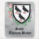 St. Thomas Becket (1120-1170) lived and died before the age of heraldry and bore no coat of arms during his lifetime. As such, his arms are said to be attributed. In heraldry-speak, his arms are described as “argent, three choughs proper, two and one”, that is, three naturalistically colored red-billed choughs on a silver (or white) field arranged with two birds on the top row and one on the bottom. The arms appear earliest c. 1400 on a monumental scale on the ceiling of one of the bays of Canterbury Cathedral’s cloisters. + At first glance, the Cornish chough seems an odd choice for the blazon of St. Thomas’s attributed coat of arms. St. Thomas was Norman not Cornish and a Londoner not a denizen of Cornwall. + There are two plausible explanations: canting and legend. Canting arms are visual plays on words, usually puns on the bearer’s name. Canting arms were immensely popular with the Normans. In Norman French, the word ‘bequet’ refers to ‘a small bird’, like the chough. In fact, the words becket and chough are often used interchangeably. According to legend, a crow flew into Canterbury Cathedral as Becket lay dying. The crow walked through and pecked about in the gore turning its legs and beak red. The red beak and red legs are what distinguished the Cornish chough (Pyrrhocorax pyrrhocorax) from other members of the crow family (Corvidae), and especially from the Alpine chough (Pyrrhocorax graculus). It should be noted that a similar origin tale for the chough’s appearance occurs in Arthurian legend. + There are no specific plants or flowers associated with St. Thomas in the same way that the leaves and flowers of the ash tree are associated with St. Etheldreda (q.v.). We have chosen to embellish our heraldry items for St. Thomas with Canterbury Bells for reasons that should be obvious even though the flowers were not introduced into England until 1597 and used to be called Coventry Bells. Canterbury Bells (Campanula medium) have elegant, bell-shaped blooms in pink, rose, lavender, blue, or white. In the language of flowers, they stand for gratitude, acknowledgment, and obligation. + Image Credits (Coat of Arms): Saints_Aplenty; (Canterbury Bells): Loose, original antique botanical print from Edward Step’s Favourite Flowers of Garden and Greenhouse (London and New York: Frederick Warne & Co, 1897), Vol. 3, pl. 159, facing p. 330, from the designer’s private collection of ephemera.