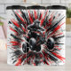 This image features a powerful black and red ATV, ridden by a figure in a helmet, surrounded by an explosive burst of red, black, and white paint splatters. The dynamic artwork captures the thrill and energy of off-road adventure, with abstract elements creating a sense of speed and impact against a stark white background.