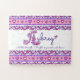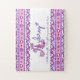 Personalized letter A monogram name and meaning jigsaw puzzle. Pretty hand drawn initial letter A monogram name and meaning girls jigsaw in purple, pink and white. Ideal for a personalized gift for a girl who has a name that starts with the letter A. This example reads Aubrey Noble strength. Bright, organized and clever or you can customize the text with your own name and message or words. Makes a unique girls birthday, or holidays gift. © Typographic letter A flowers and hearts hand drawing and pattern uniquely created by Sarah Trett. www.sarahtrett.com for www.mylittleeden.com