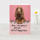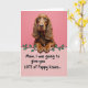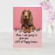 This card features a sweet illustration of a long-eared dog with wavy auburn fur gazing straight ahead with soft, golden-brown eyes that feel like an affectionate hello ❤️. Its dark nose and detailed muzzle are carefully shaded, and its sturdy front paws rest along the top edge of a pale pink panel, like it’s leaning in close for attention. The background stays a uniform rosy pink, keeping the focus on the dog’s tender, loyal expression. A thin, hand-drawn vine with small green leaves runs horizontally near the top of the lower section, adding a gentle touch of nature 🌼. Just beneath that line, the message is centered in rounded, dark lettering, with “LOTS” set in all caps for extra emphasis. The text reads, “Mom, I was going to give you LOTS of Puppy kisses...”, and the ellipsis leaves the moment hanging like a teasing pause. The dog’s long ears frame its face as they drape downward against the pink backdrop, and the green vine sits neatly above the centered words.