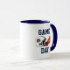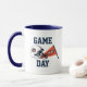 This spirited mug design proudly showcases support for Auburn University on game day! It features a classic football helmet with the iconic blue "AU" logo, centered between the words "GAME" and "DAY" in bold blue lettering. A vibrant orange pennant extends from behind the helmet, proudly displaying a stylized tiger mascot face and the word "TIGERS." This impactful and recognizable design is ideal for enjoying a favorite beverage while representing allegiance to the Auburn Tigers.