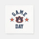 This spirited square paper napkin design proudly showcases support for Auburn University! It features the iconic Auburn "AU" logo prominently displayed at its center, vibrant in its traditional orange and blue. Above and below the logo, the words "GAME" and "DAY" are boldly presented in blue, arched lettering, perfectly capturing the excitement of game day. Two vibrant orange stars flank the 'AU' logo, adding to the energetic display. The napkin's clean white background and subtle orange border make it an ideal choice for any game day celebration or gathering.