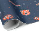 This design pattern features Auburn University's emblematic "AU" logo in bold navy blue with an orange outline. The word "Auburn" appears in stylized, uppercase navy blue letters with orange accents, providing a prominent contrast against the white background. An additional graphic of a tiger's eyes, enclosed in an oval shape with an orange border, reinforces Auburn’s iconic mascot. Scattered across the design are minimalist starburst shapes and small dots in navy blue, adding a festive and dynamic touch that complements the university's spirit and colors.