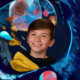 A cartoon boy with light skin and brown hair, wearing a virtual reality headset.