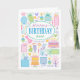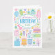Cakes, presents, balloon, flowers, and party hats fill this birthday card for your aunt and also form the bottom border on the inside of the card. A bright pastel feminine birthday card full of every thing birthday and party related for her.