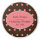 A chocolate brown background with pale pink polka dots... pale pink center oval shop sign in vintage style with chocolate brown antiqued lettering... silver gray accents... reads... "Aunt Teek's Curiosity Shoppe ... Est. 2022"...