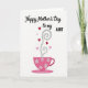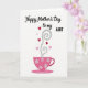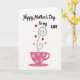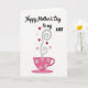 This card features a cozy, family-loving scene built around a tea theme, with a gentle romantic touch in the little hearts drifting upward ❤️. Across the top, the message “Happy Mother’s Day to my AUNT” appears in flowing dark lettering, centered and easy to spot. Below the text sits an oversized teacup and matching saucer in deep rose pink, like a shared cup during a warm visit. The cup is decorated with simple white daisy-like flowers that feel friendly and affectionate, like a small gesture from someone close 🌼. From the rim, curling steam rises in soft gray dotted swirls, giving the impression of a quiet conversation lingering in the air. Mixed into the steam are floating hearts in reds and light pinks, as if care and closeness are lifting right off the drink. The background stays plain white, making the pink cup, white blossoms, and gray swirls stand out clearly. The saucer sits directly beneath the cup in the same deep rose tone, with the flower pattern concentrated on the cup’s front.