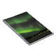 Notebook with green rays of aurora borealis (northern lights) in the night sky over a frozen lake in Lapland.