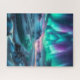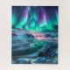 Northan lights (Aurora Borealis) descending from the sky over a snowy landscape and a river leading the eye to a distant town brightly light up in the night seen, by martinspixs.