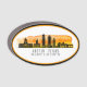 Stylish oval car magnet design features Austin Texas city skyline silhouette with sunset watercolor splash on pale yellow background and latitude & longitude coordinates