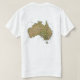 An editable title and slogan accompanies the white southern cross stars on the blue ensign of the Australian flag on the front of this t-shirt. The back displays a detailed map of Australia.