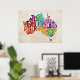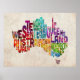 A typographic text map of Australia. The map is made from the names of the states and territories of Australia, in an urban watercolour style.