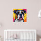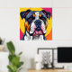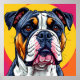 Vibrantly illustrated close-up of a bulldog's face. The dog has expressive eyes and a distinct coat pattern with bold black, white, and tan colors, set against a bright, abstract background of circular shapes in pink and yellow hues.