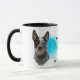 A portrait of a beautiful Australian Cattle Dog is the feature on two sides of this mug. Each image is placed on a bright blue spatter background. Between the two images is the text that describes this loyal and protective companion, with "the CATTLE dog" in black at the bottom. All the text is easily customized to anything you'd like so that you may describe your own loyal friend.