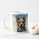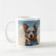 Australian Cattle Dog coffee mug featuring a detailed blue heeler portrait against a soft sky backdrop. This design captures the alert expression and loyal character of the breed, paired with a subtle bandana detail that adds warmth without overpowering the artwork. Printed in rich, lasting color on a classic ceramic mug, it’s both functional and collectible.