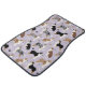 Cute Australian Shepherds / Aussie dogs in black, brown and merle coats sit and stand scattered dog bones and paw prints on a light purple background.