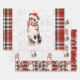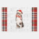 An adorable Australian Shepherd dog is ready for the holiday season with his or her red and white striped winter scarf and Santa hat, making this dog a real fashionista. This cute Christmas dog is paired with a plaid print in seasonal red and green hues on this set of gift wrap for the dog lover.