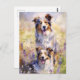 Colorful watercolor artwork of a Australian Shepherd sitting in a field of spring flowers.
