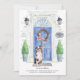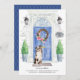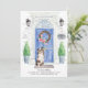 Announce your new address with our stylish announcement featuring a Australian Shepherd, blue front door, welcome mat, slate sign, topiaries and a floral wreath set on a gray brick background.