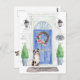Announce your new address with our stylish announcement featuring a Australian Shepherd, blue front door, welcome mat, slate sign, topiaries and a floral wreath set on a gray brick background.