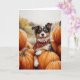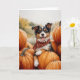 This greeting card features a watercolor portrait of an Australian Shepherd dog sitting on a pile of pumpkins in a pumpkin patch.