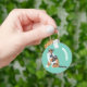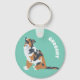 This keychain is ready to be personalized with a name and has realistic style illustrations of Australian Shepherd Dogs or Aussies set against a mint green background.