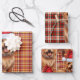 An adorable Australian Terrier dog is ready for the holiday season with holiday hat. This cute Christmas dog is paired with a red and gold holiday plaid on this set of gift wrap for the dog lover.