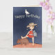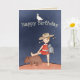 An Australian Themed card featuring a girl in a red dress holding a koala, and leaning her foot on a wombat, Overhead you have a cockatoo balancing on the text