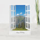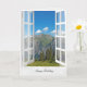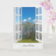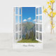 Open window and sheer curtains view of Austrian Alps mountain scene for birthday.
