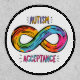 An illustrated typography design that says Autism Acceptance with a colorful rainbow colored infinity symbol.