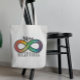 Imagery - Rainbow Infinity Symbol: The central feature of the tote bag is the rainbow infinity symbol, prominently displayed. This symbol, with its continuous loop, represents the infinite possibilities and variations within the neurodiverse community. The use of the rainbow motif within the infinity symbol serves as a celebration of the diversity and inclusivity of all neurotypes, especially those within the autism spectrum.