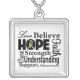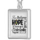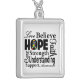 Words of inspiration remind you what really matters when facing challenges. Wear it as a pendant necklace for your cause with our collage style tribute silver chain jewelry featuring inspirational, empowering words of Love, Believe, Hope, Faith, Strength, Understanding, Support, Awareness and Cure. Makes a beautiful gift for you and/or someone in your life to remind them of hope.