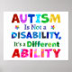 Positive message of “AUTISM Is Not a Disability, It's a Different ABILITY” with beautiful Autism puzzles to understand and educate about people with Autism spectrum disorder and Asperger's syndrome.