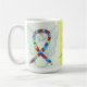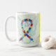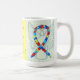 Autism uses a puzzle awareness ribbon to show support for its awareness. This custom mug features puzzle awareness ribbon guardian angel art paintings with the message "I Hope and Support Autism Awareness!" The custom puzzle awareness guardian angel ribbon art picture coffee cups or mugs can be customized with personalized messages to make great cause mugs for awareness fundraisers, awareness cup gifts, or other special events or cause support occasions. Make your own customized words for a personal message of hope and support to share!