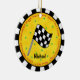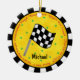 This ornament is great for an auto motor or motorcycle race fan or someone who has won a race, minor or big or for a momento of attending a race. It's personalized with a name on the front and year or date on the back. A waving black and white checkered flag is centered on a textured yellow background. A black and white checkered border surrounds the art. Fully customizable. The words in red text line the inside of the border and say Race Fan, Start the race and checkered flag. Green stars are on the background. This design is great for non-race driver specific fans and for multiple race type formats. Fully customizable and makes a great gift.