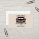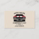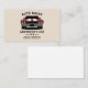 A business card for auto sales features a vintage red car with white stripes down the middle on a beige background and a separator with two stars. It might be suitable for activities such as car driver, taxi, transport, auto repair or restoration, car wash, etc.