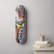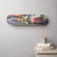 Skateboard deck featuring a car doing a burnout, an ambulance and a nitro funny car.