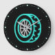 Modern and fun wall clock design for gearheads and other car enthusiasts features a black background with aqua dot clock face and a neon aqua and white auto wheel / tire in center.