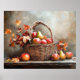 A bountiful autumn basket containing apples and pears, adorned with vibrant fall leaves, arranged on a rustic wooden surface, creating a warm and inviting seasonal composition.