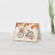 Pretty Autumn inspired note cards featuring a bicycle with a basket holding a pumpkin and fall foliage all around on the front. The inside is blank holding only a very light image of fall leaves as a background for your personal messaging.