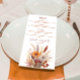 Complete your reception tablescape with this beautifully designed White Autumn Boho Floral Wedding Menu. Featuring romantic watercolor florals in rich fall hues, this menu highlights the bride and groom’s names and curated dinner selections in a stylish blend of elegant script and modern typography. Perfect for fall wedding themes, the feminine design adds warmth and sophistication to each place setting. A thoughtful detail that ties in seamlessly with your autumn wedding stationery, this menu enhances your guests’ dining experience while showcasing your attention to every graceful touch.
