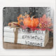 Stack of books with autumn pumpkins and berries tied with string in rainy window effect