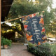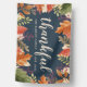 Festive fall house flag features "thankful" in hand lettered calligraphy script, surrounded by colorful fall leaves and branches in rich autumn hues on a rich navy blue background. Personalize with your family name and year established beneath for a perfect way to add autumn cheer to your home this Thanksgiving season.