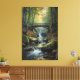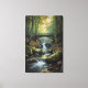 A serene forest scene featuring a rustic wooden bridge above cascading waterfalls, surrounded by mossy rocks and soft autumn foliage. The warm light filtering through the trees creates a peaceful, immersive atmosphere perfect for nature lovers and tranquil home décor. This high-quality artwork brings depth, calm, and elegance to any space.