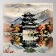 This artwork portrays a peaceful Japanese castle in autumn, painted in a soft watercolor style. The multi-tiered castle stands prominently at the edge of a calm lake, its dark rooftops contrasting beautifully with the warm fall colors surrounding it. Vibrant shades of red, orange, and golden yellow foliage frame the scene, while misty mountains rise in the background, adding depth and atmosphere.