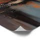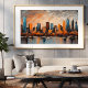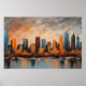 This poster features an abstract acrylic painting that beautifully captures a cityscape at sunset. The cityscape is composed of bold, geometrically shaped buildings that stand tall against the backdrop of a dramatic sky. The buildings, in shades of blue, gray, and black, add a sense of depth and dimension to the scene. The waterfront, dotted with trees, adds a touch of nature to the urban landscape. The trees, showcased in a vibrant shade of orange, hint at the season of autumn. The buildings and trees cast their reflections onto the water, creating a mirror-like effect that enhances the overall visual appeal of the painting. The sky is a spectacle in itself, with a dramatic mix of gray, orange, white, and blue. The colors of the sky seem to change with the setting sun, adding a sense of dynamism to the scene. The overall color theme of the skyline complements the colors of the sky and the waterfront, creating a harmonious visual experience. This modern art poster, with its abstract depiction of a city at sunset, is sure to captivate viewers with its bold colors, dramatic imagery, and artistic flair. It’s a testament to the beauty that can be found in urban landscapes and the changing seasons. Whether you’re an art enthusiast or simply someone who appreciates beautiful scenes, this poster is sure to make a great addition to your home.