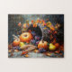 A vibrant painting of a cornucopia overflowing with pumpkins, grapes, pears, wheat, and autumn leaves.