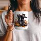 Autumn Cowgirl Coffee Mug. © Radenbrea Studios at Zazzle. An autumn coffee mug with a Cowgirl theme. It has a pair of cowgirl boots and a hat on one side and a Cowgirl and her horse on the other side, in autumn colours.