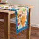 Give your home a festive vibe all season long with this stylish autumn patterned table runner. It has a bold blue border and an assortment of cozy illustrated fall objects, including leaves, pumpkins, knit hats, and mugs. Perfect for Thanksgiving or any other fall occasion. /brs/a