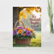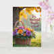 This card shows a sunlit autumn scene where a woven wicker basket sits low on a stretch of green grass, brimming with flowers that feel like a thoughtful gift from one loved one to another ❤️. Purple and orange daisy-like blooms spill outward among small white blossoms, with fresh green leaves adding soft texture around the basket’s rim. The warm light filtering in from behind gives the arrangement a gentle glow, like a quiet moment shared between close family or friends. In the foreground, a few fallen leaves rest on the grass, hinting at the season without stealing attention from the bouquet. The background fades into a soft blur of golden foliage, suggesting a mature tree and late-afternoon sunshine. In the upper right area, the message “To a Wonderful Daughter in-Law!” appears in deep burgundy lettering, standing out clearly against the lighter backdrop 🌼. The basket’s braided handle and the mix of purple, orange, and white petals are shown in crisp detail against the softly blurred golden leaves.